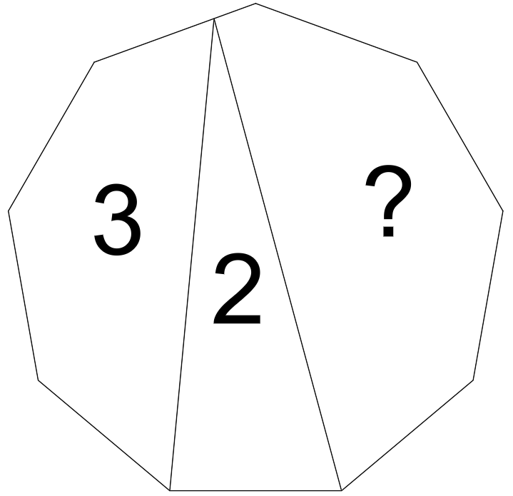 Here is a regular polygon with nine sides. If two of the regions have areas 3 and 2 as shown, what is the area of the third region?